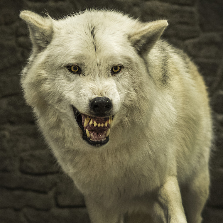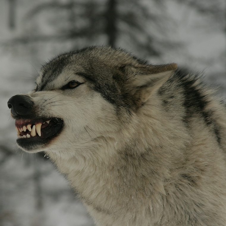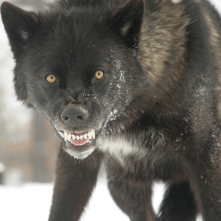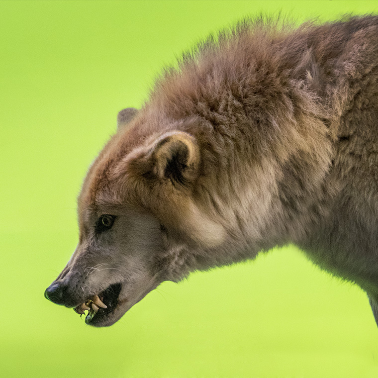 A snarling black wolf or maybe it's a snarling white wolf? Very seldom do we get a call for wolves either for print or film, which doesn't require a hair-raising, teeth-baring, 'snarling' shot. Because this is requested so often, we've perfected the art of safely delivering the famous snarling-wolf-shot, whether it's outside in the snow or inside a green screen studio.